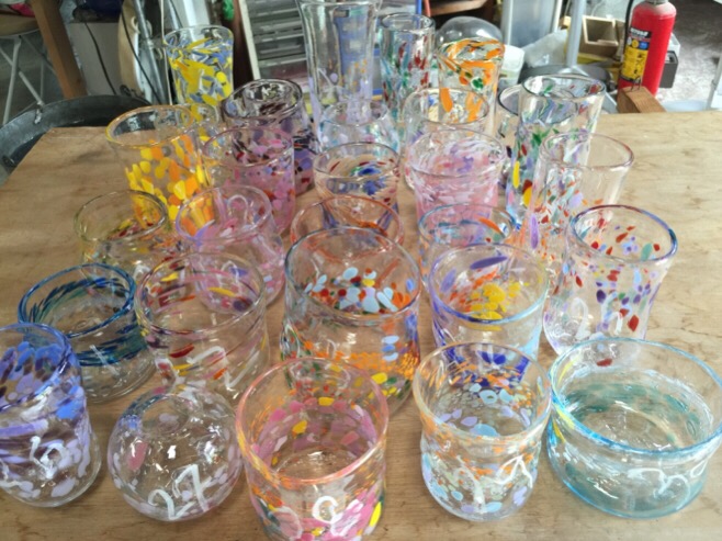 18日に親子で吹きガラス体験でコップを作ってくれた 方たちがコップを受け取りに来てくれました。まずいらないビンで練習をして さー、本番です。自分のコップに大きな字で名前と作った日ずけを書いて 完成ー。